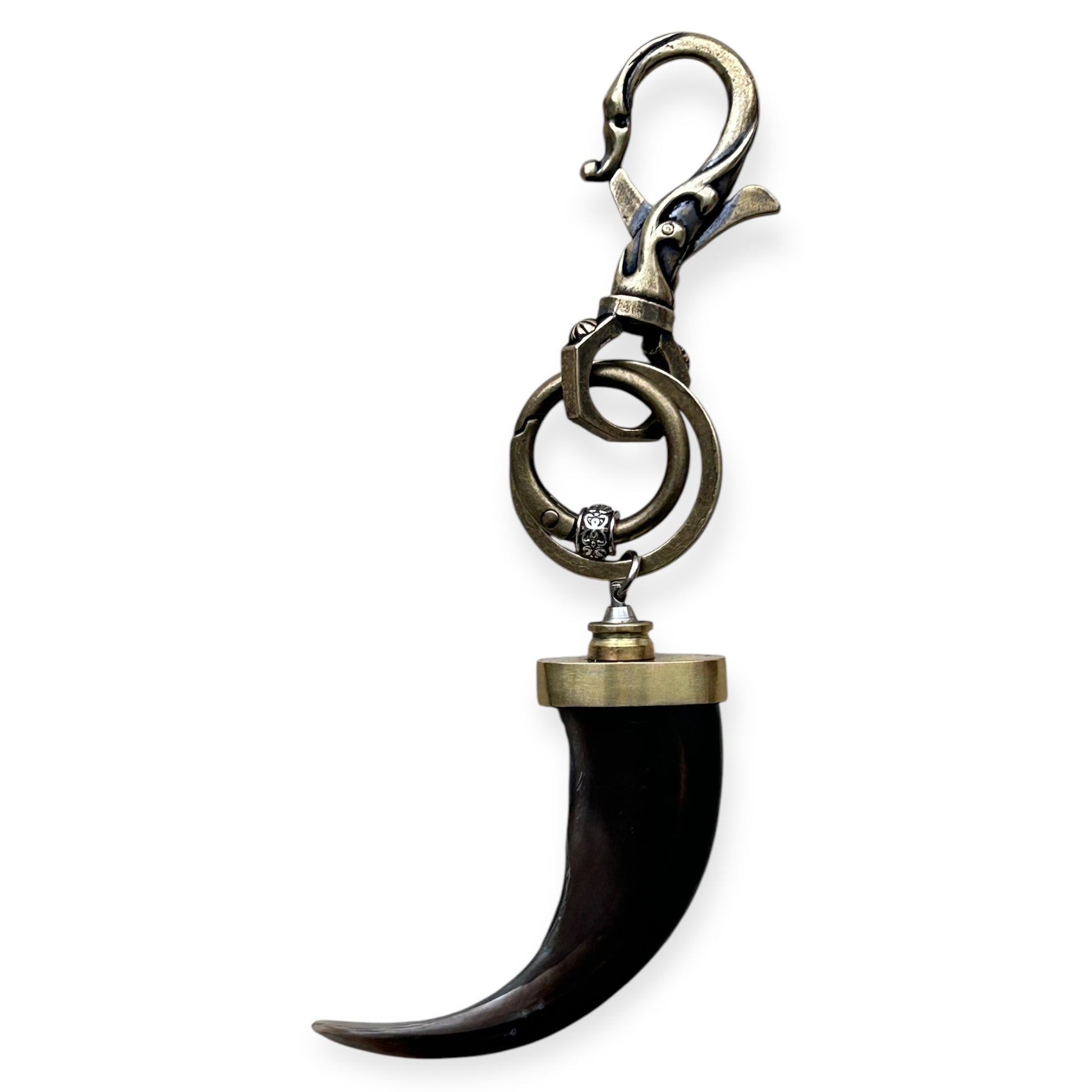 存在感のあるラージリングとデザイン性の高いフックにより、バッグやベルトループにもしっかり装着可能。天然素材ならではの力強さと、クラシカルな金属パーツのバランスが美しく融合しています。