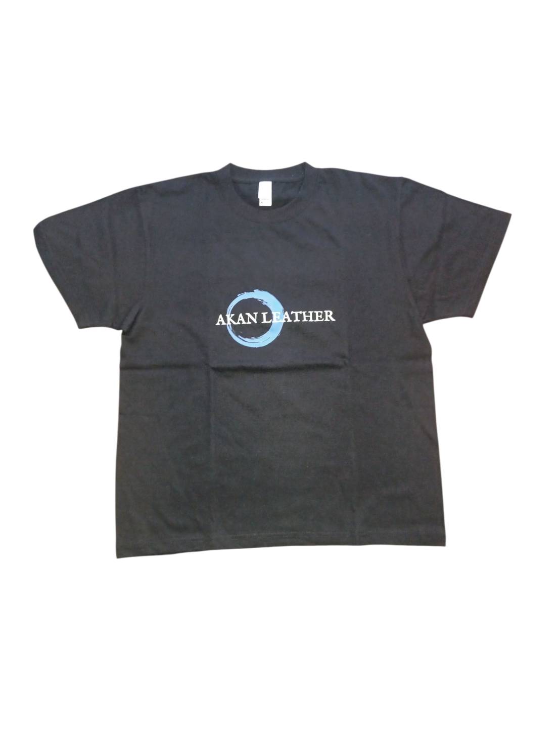 フロントには水彩のような青のプリントに「AKAN LEATHER」の文字を、背面にはシンボルロゴをシンプルに配置。