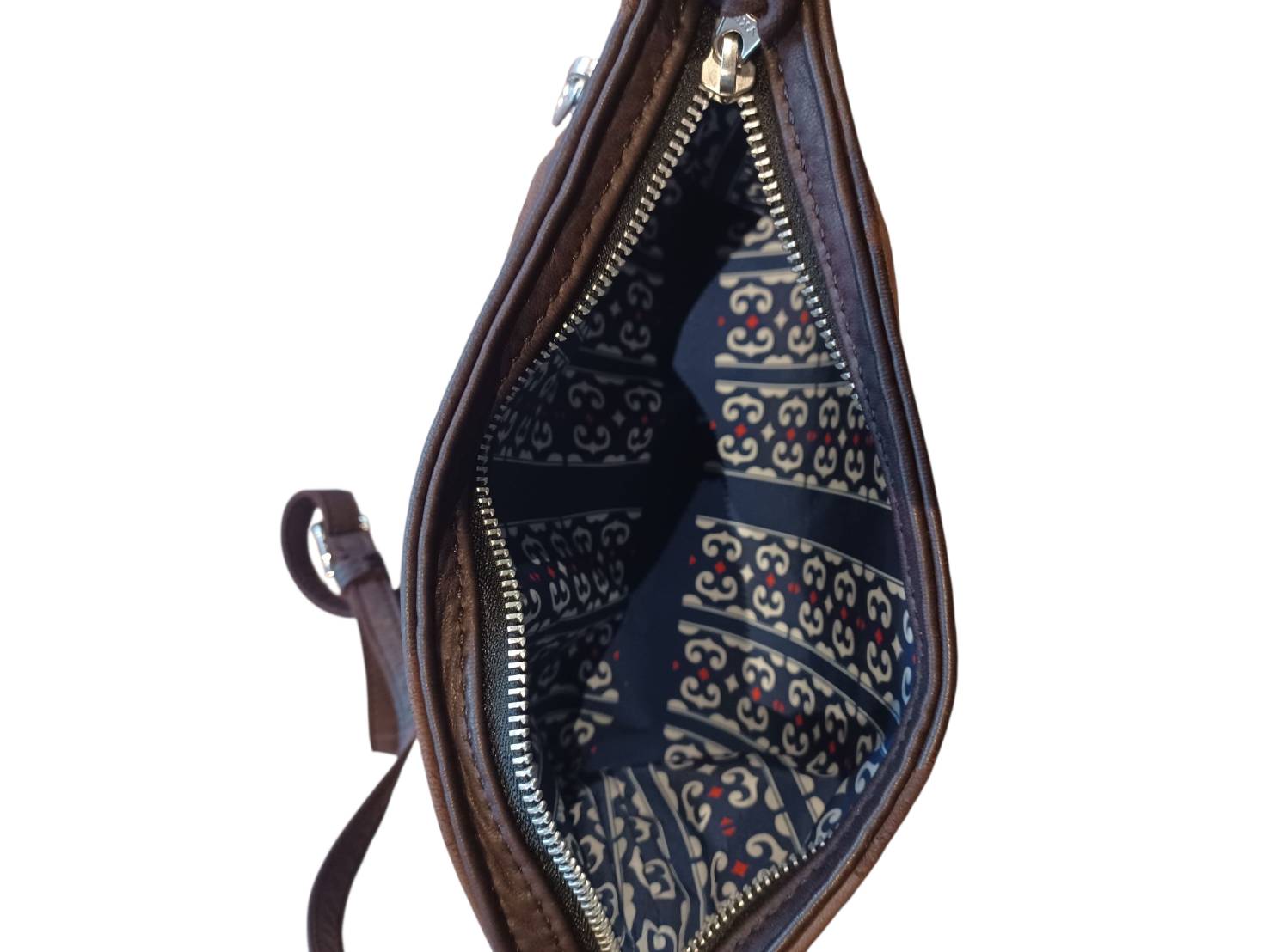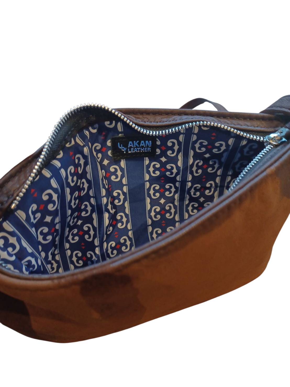 AKAN LEATHERのAL-BAGLINE サコッシュをAL004と同様のアイヌ紋様柄生地を裏地に使用したモデルになります。
